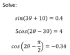 A good selection of questions including of the type... sin2x=0.5, sin(x+10)=0.5, sin(3x+10)=0.5 and then quadratic trig equations. Includes answers. PDF here.