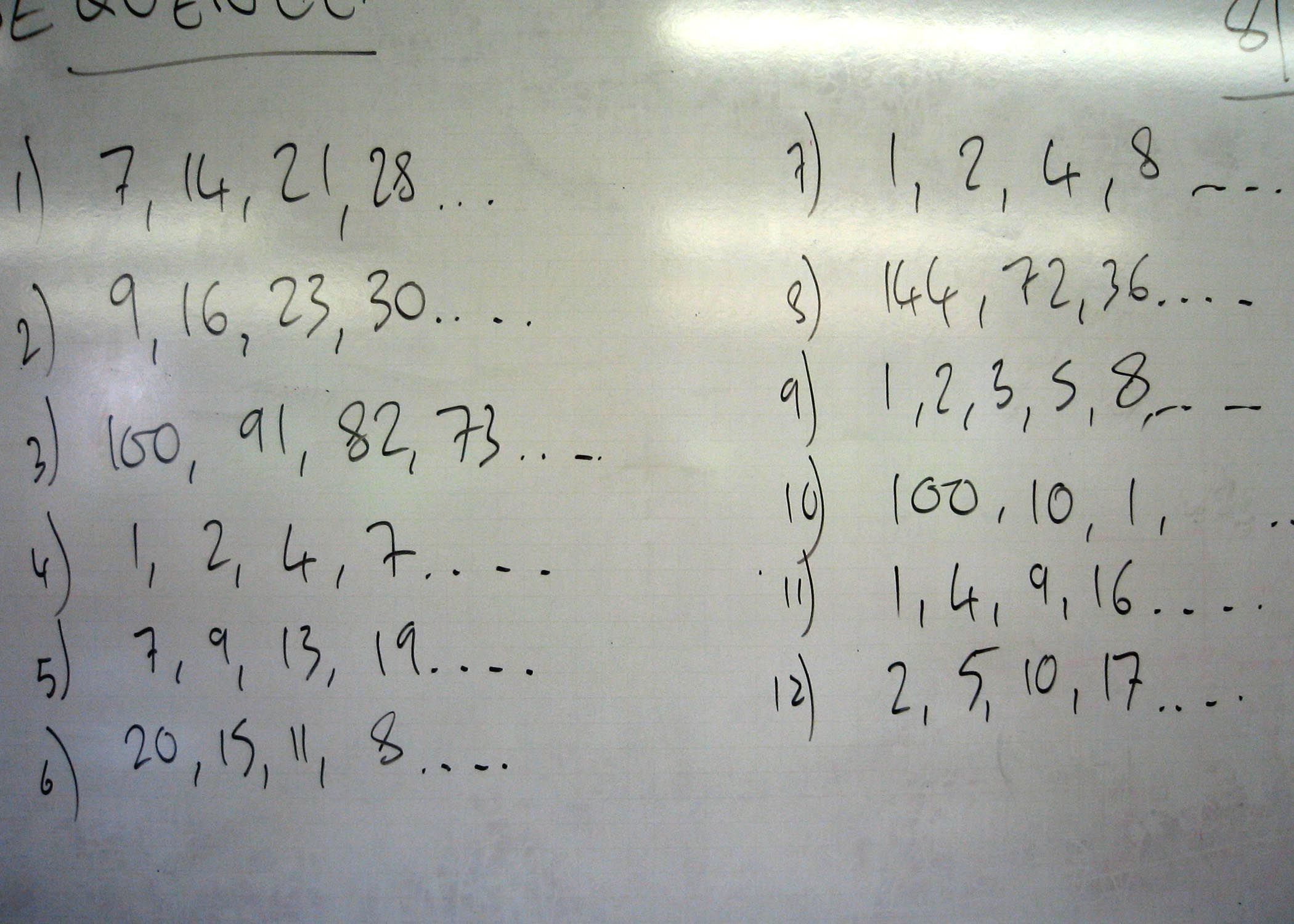 Simple sequences for pupils to continue for 3 more terms and say what the rule is (term to term). Intended as a first activity of a sequences topic. Answers included. A copy of some other sequences from my whiteboard is (full res version).